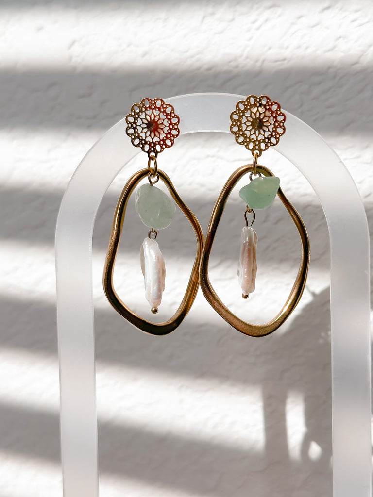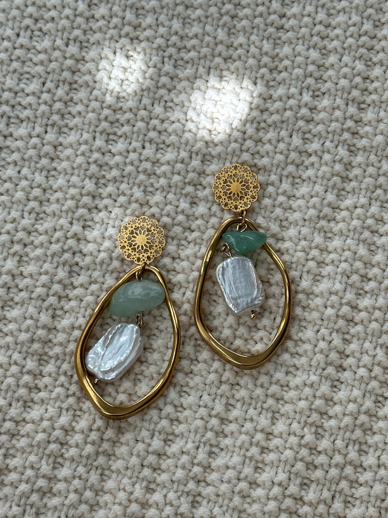 Pantallas elegantes con piedras en tonos verdes suaves y detalles irregulares en acero inoxidable dorado. Su diseño orgánico y femenino aporta un toque fresco y sofisticado, perfectas para resaltar con delicadeza cualquier look.