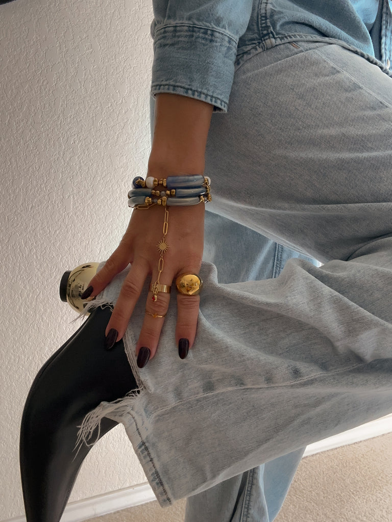 Set de pulseras elásticas en acrílico con perlas de agua dulce y delicados detalles en acero inoxidable dorado. Su mezcla de texturas y tonos dorados crea un look moderno y sofisticado