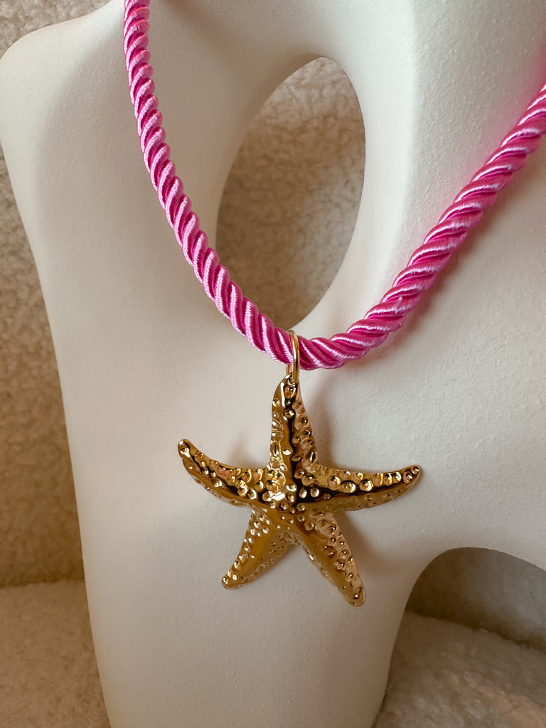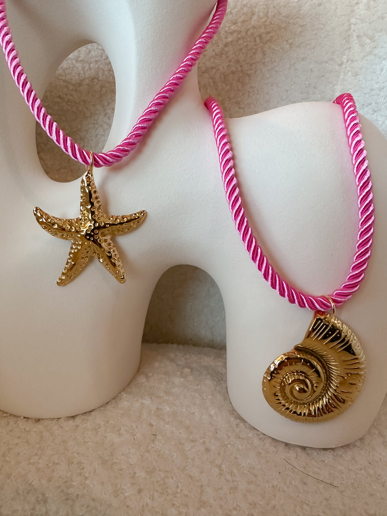Sumérgete en el encanto del verano con nuestros collares Sol del Mar. Cada pieza cuenta con una cuerda de satén trenzada en tono rosado vibrante, combinada con un colgante dorado que evoca el esplendor del océano: una estrella de mar y una caracola marina, talladas con textura brillante y detalles llamativos.