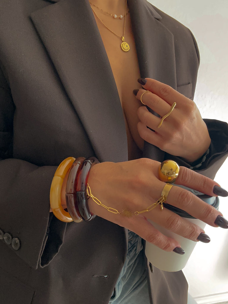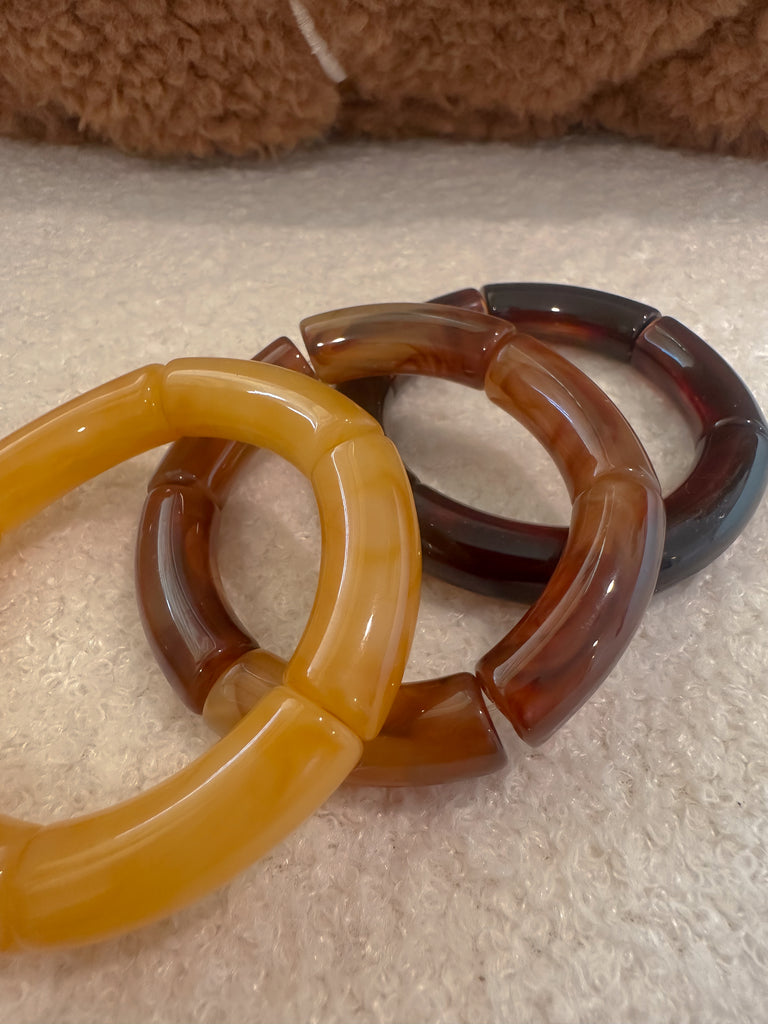 Este set de 3 pulseras acrílicas combina tonos cálidos inspirados en la tierra y el sol. Su diseño grueso y brillante añade un toque retro y elegante, perfecto para usar juntas o por separado. Ideales para complementar looks neutros o dar contraste a un outfit colorido